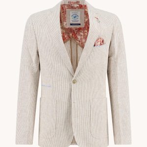 De Blazer Linen Stripe van A fish named Fred is het toonbeeld van zomerse elegantie. Het subtiele krijtstreepmotief in combinatie met de linnenlook stof geeft deze blazer een frisse, verfijnde uitstraling. Ideaal voor mannen die ook op warme dagen stijlvol voor de dag willen komen.