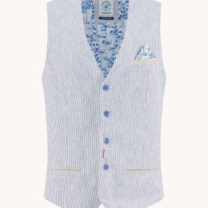 De Waistcoat Linen Stripe is hét gilet voor wie houdt van een zomerse look met karakter. De fijne verticale streep zorgt voor een tijdloze uitstraling, terwijl de kleurrijke Fred-voering met zeil- of geometrisch motief voor een verrassend detail zorgt.