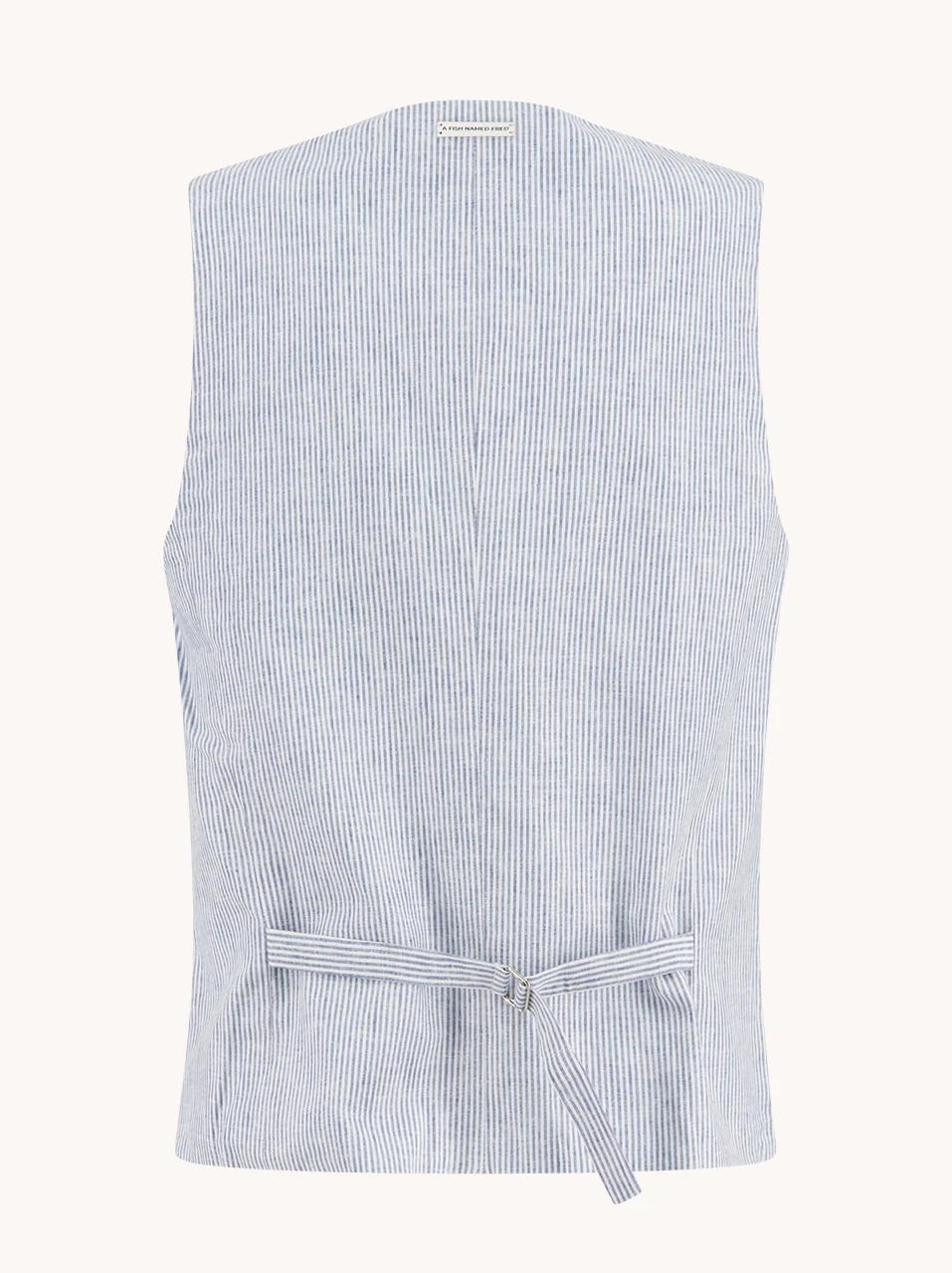 De Waistcoat Linen Stripe is hét gilet voor wie houdt van een zomerse look met karakter. De fijne verticale streep zorgt voor een tijdloze uitstraling, terwijl de kleurrijke Fred-voering met zeil- of geometrisch motief voor een verrassend detail zorgt.